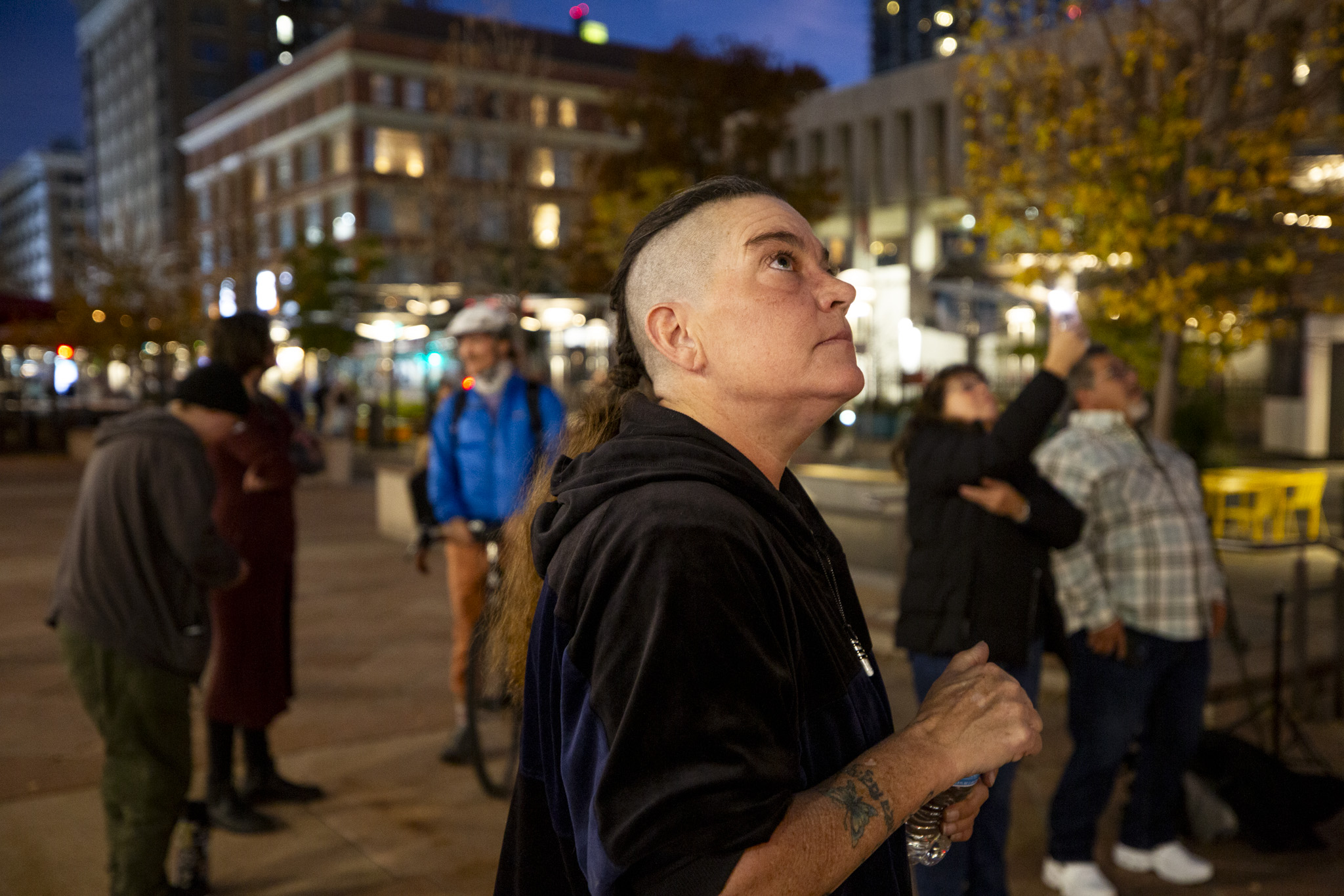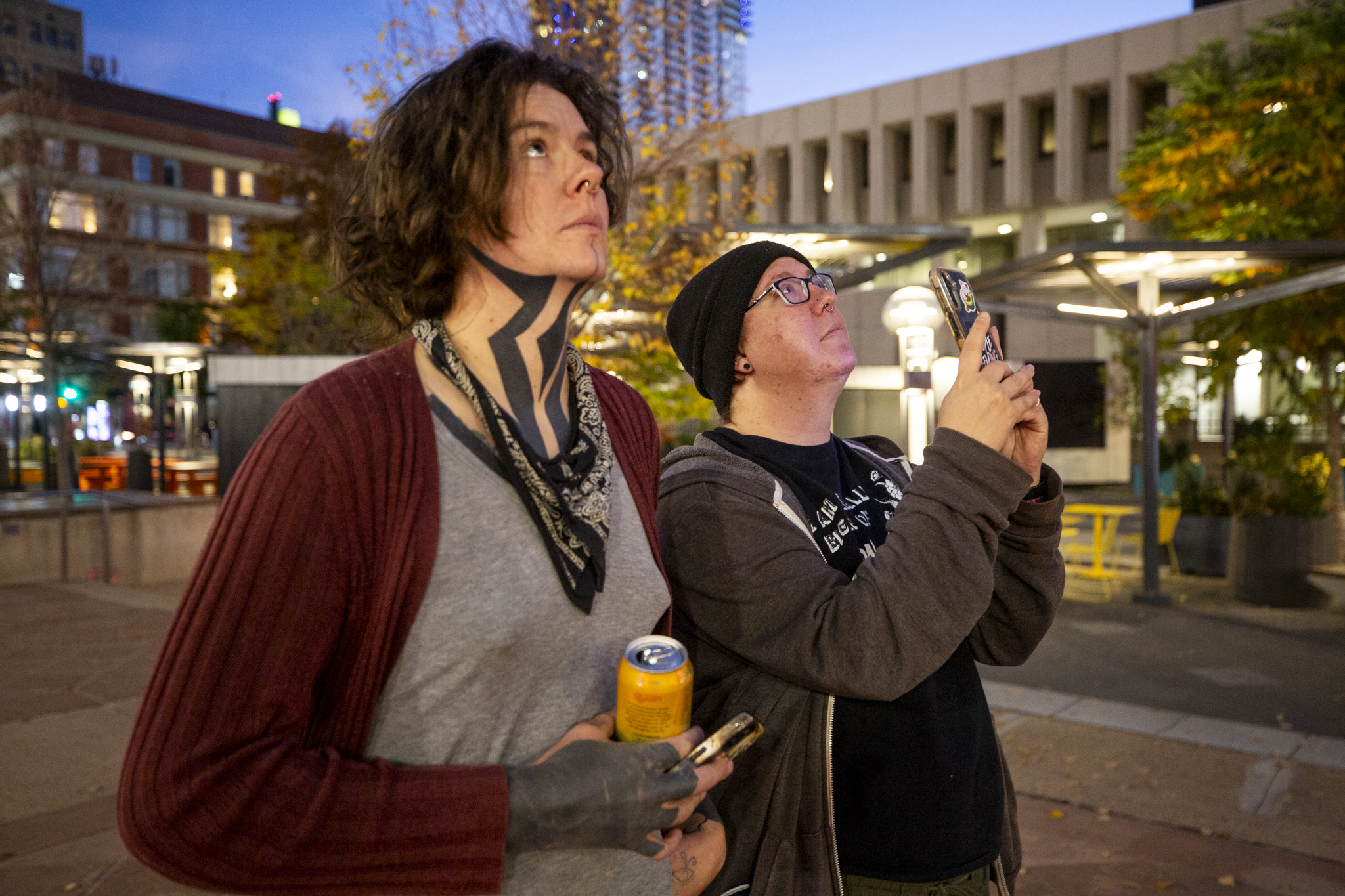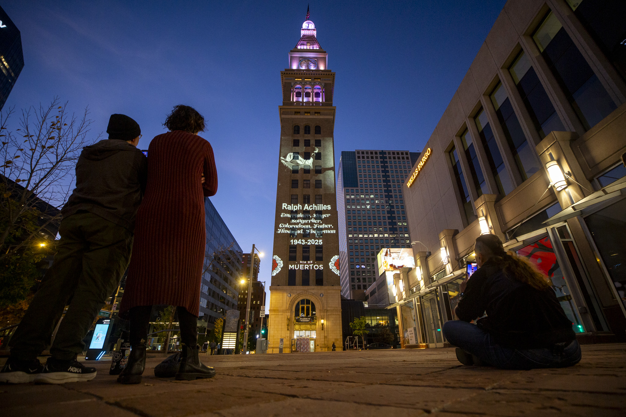 Ellis Koop (right) and Rhosyn Stetler watch for a portrait of Laura Givens (1953-2025) to light up downtown's Daniels and Fisher clocktower for Dia de los Muertos, Nov. 1, 2025.
