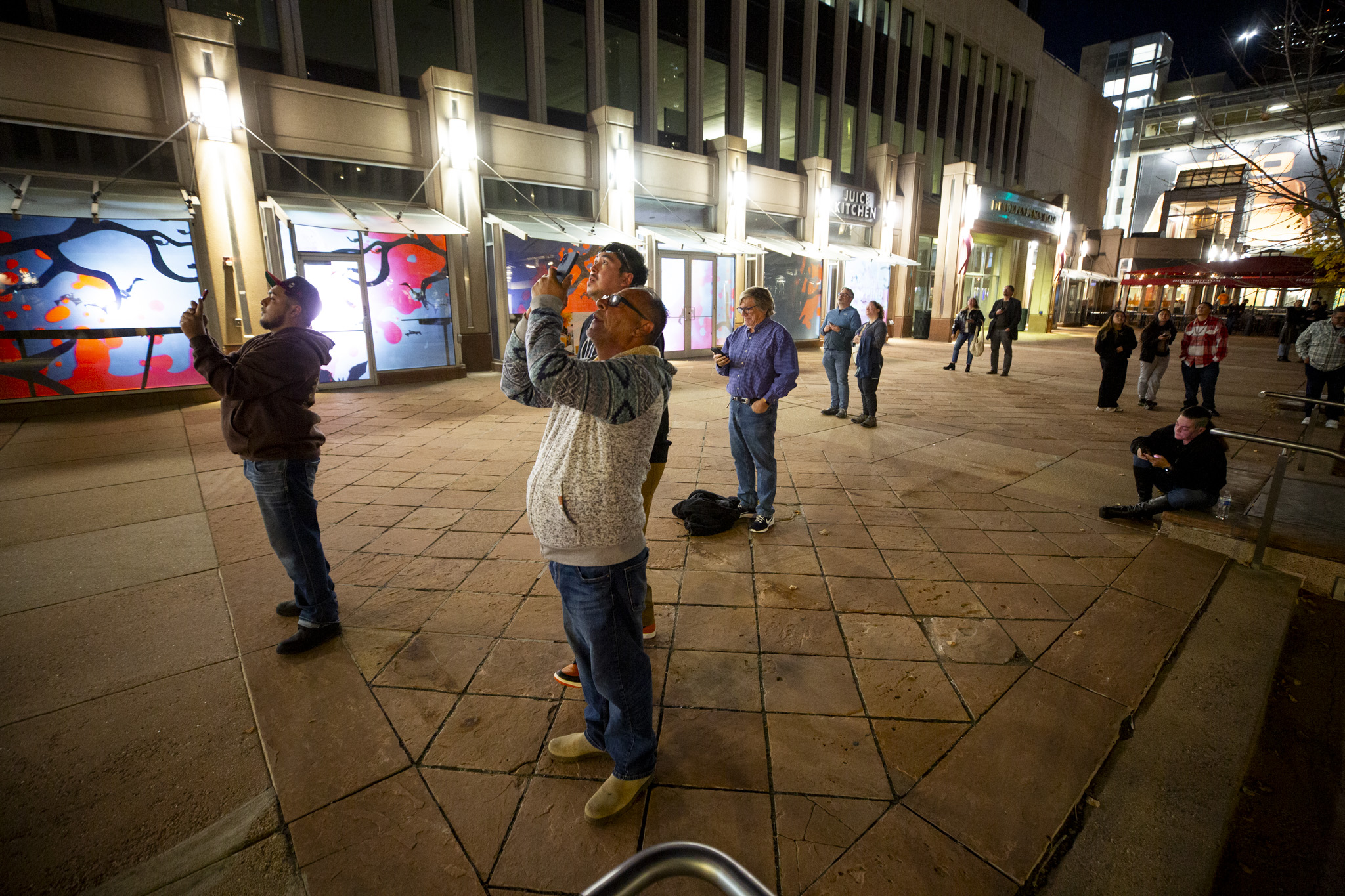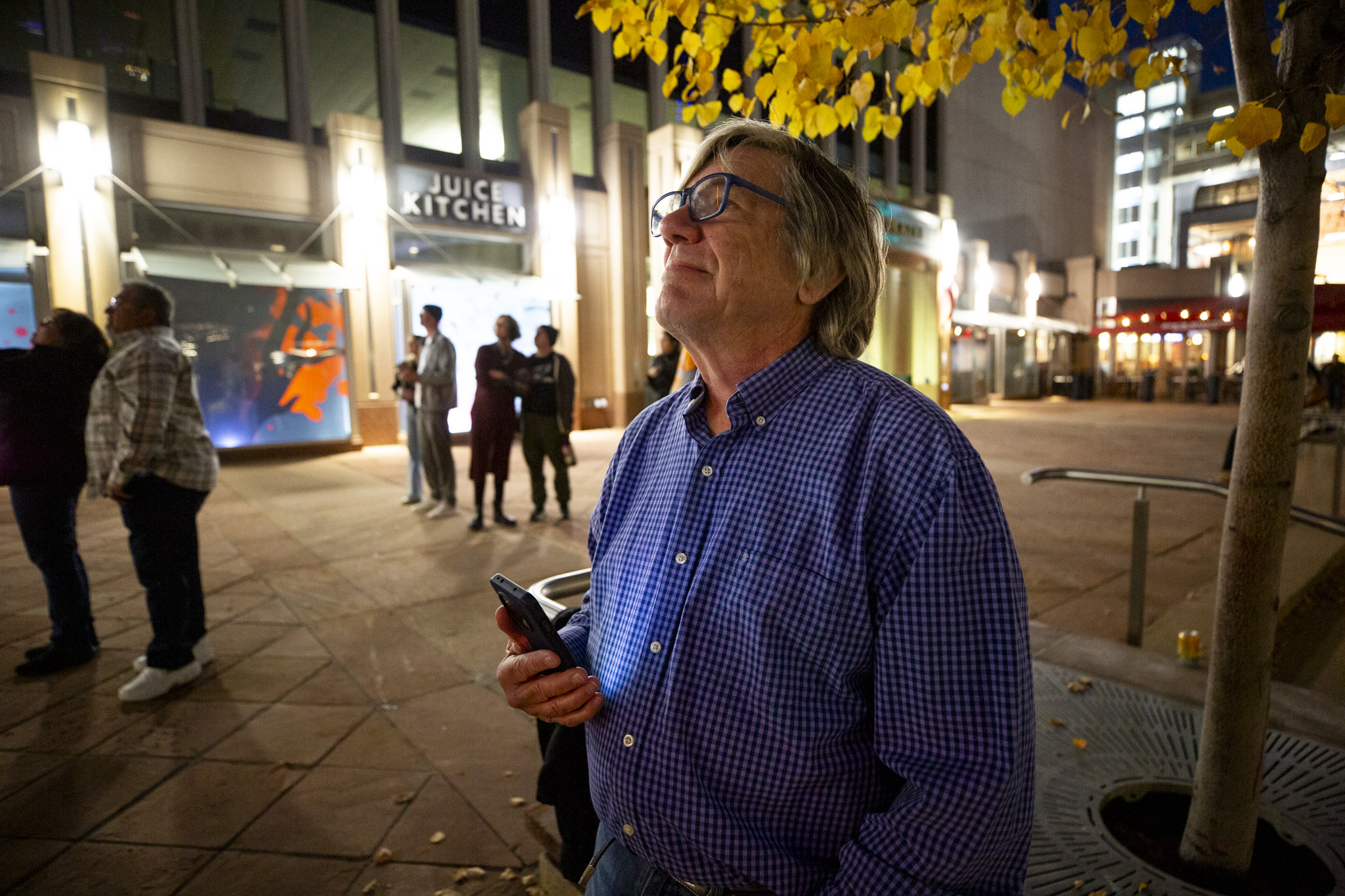 Peter Locke watches for a portrait of his late wife, Diana Locke (1961-2025), to illuminate downtown's Daniels and Fisher clocktower for Dia de los Muertos, Nov. 1, 2025.
